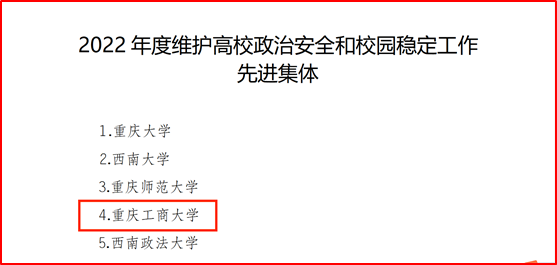 近日,重庆市教育委员会和重庆市公安局联合印发《重庆市教育委员会 重庆市公安局关于2022年度维护高校政治安全和校园稳定工作先进集体和先进个人的通报》(渝教安函〔2023〕38号),我校荣获“2022年度维护高校政治安全和校园稳定工作先进集体”荣誉称号。这是自2014年以来,我校安全稳定工作连续获得的第9个先进集体荣誉称号。另有4位同志荣获“2022年度维护高校政治安全和校园稳定工作先进个人”荣誉称号。