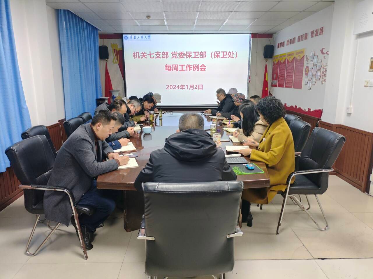 2024年1月2日上午,机关七支部、党委保卫部(保卫处)在保卫处会议室召开了每周工作例会。支部党员、保卫干部、安保大队队长和副队长参加了会议,会议由支部书记、党委保卫部部长(保卫处处长)钱忠坤同志主持。会上集中学习了《国家主席习近平发表二〇二四年新年贺词》《习近平:以美丽中国建设全面推进人与自然和谐共生的现代化》等资料。会议传达了《重庆市教育委员会关于印发职工医保门诊共济保障机制改革应急处置工作方案...