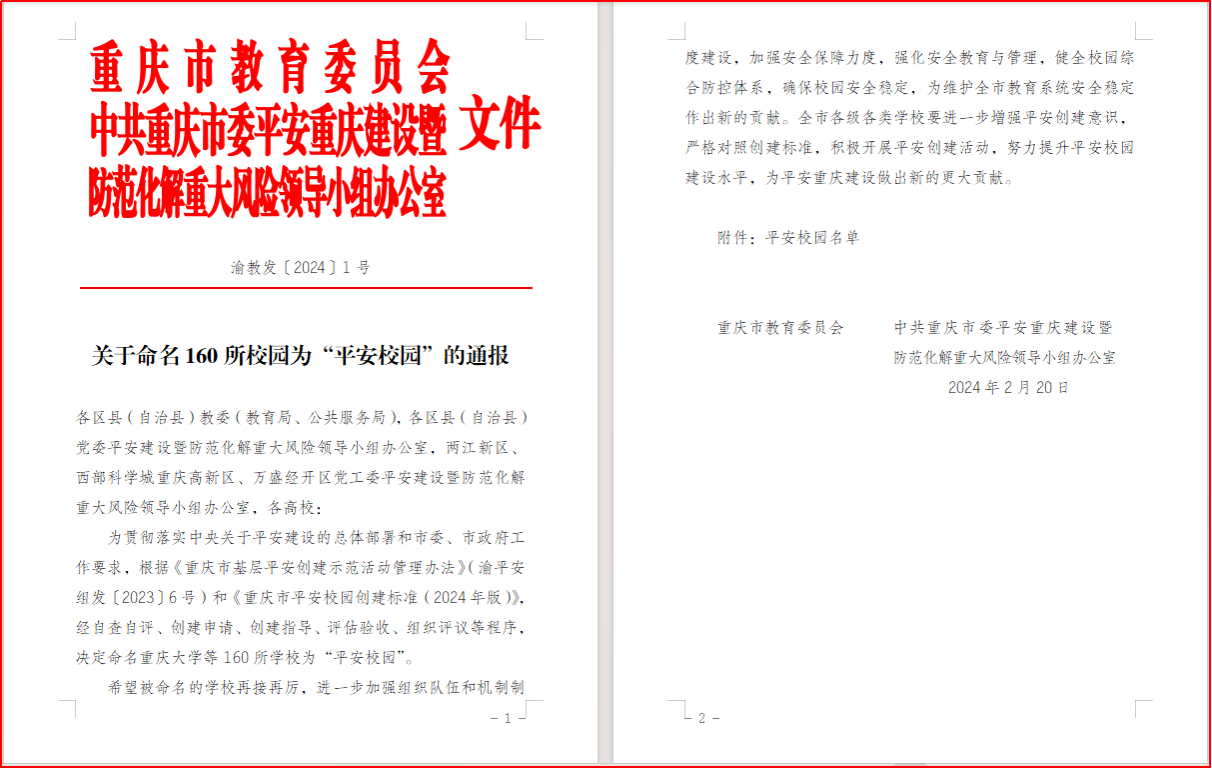 2月20日,重庆市教育委员会、中共重庆市委平安重庆建设暨防范化解重大风险领导小组办公室联合印发《关于命名160所校园为“平安校园”的通报》(渝教发〔2024〕1号),决定命名全市160所学校为“平安校园”,其中,高等院校11所(本科院校5所,高职专科6所),我校位列本科院校第3名。春节前夕,按照上级文件要求,党委保卫部(保卫处)牵头,相关单位密切配合,对照《重庆市平安校园创建标准》(2024年版)》中的135个指标,精...