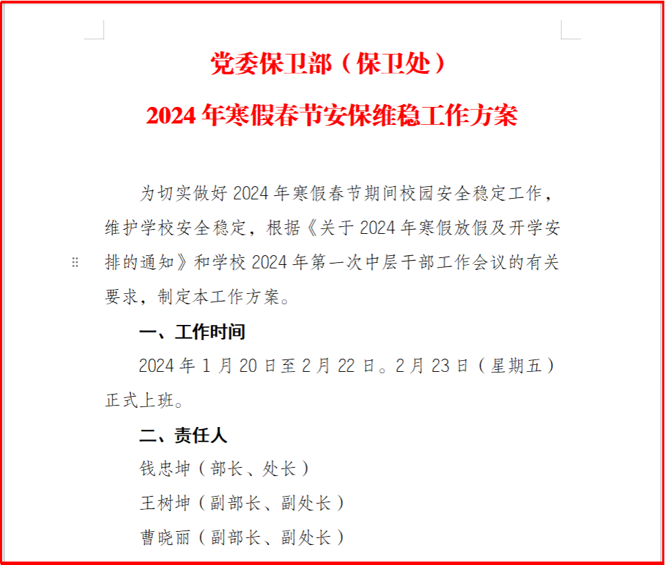 一、制定工作方案,细化工作举措制定了《党委保卫部(保卫处)2024年寒假春节安保维稳工作方案》,协助党政办出台了《关于做好寒假期间学校安全稳定工作的通知》,放假前召开2次专门会议安排部署,寒假期间召开了寒假春节安保维稳工作推进会1次,对寒假春节安保维稳工作进行了再强调再布置,确保了各项工作有力有序推进。二、线上线下结合,加强理论学习要求全体干部及队员要自觉加强学习,为每名干部发放了一本学习资料《习近...