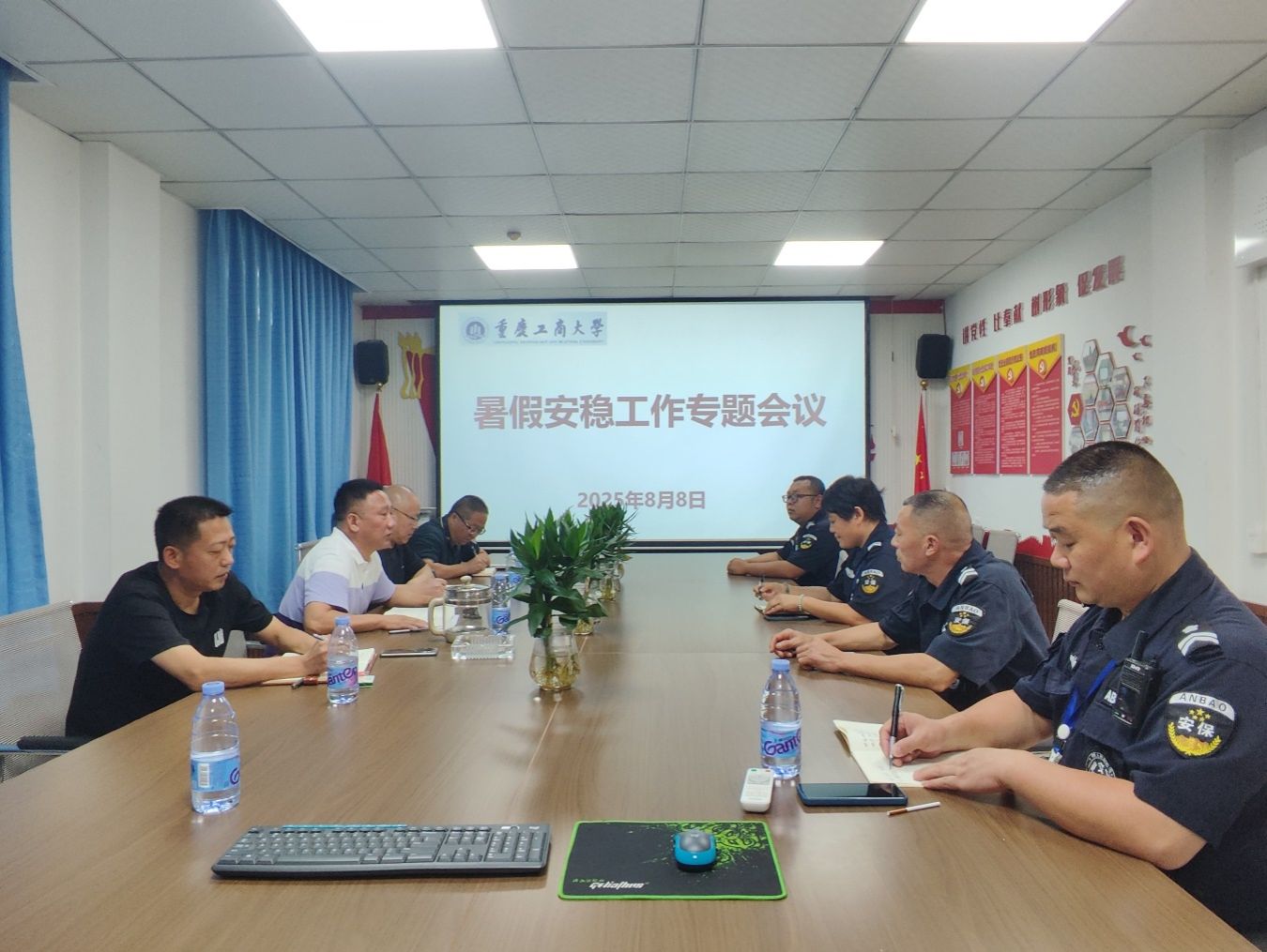 8月25日下午,党委保卫部(保卫处)在保卫处会议室召开暑期安全稳定工作会。沙云处长、邱胜祥副处长、王树坤副处长、治安科彭文涛科长,安保大队姚春安、钟华、周汪洋参加。会上,邱胜祥副处长传达了“学校2022-2024级工科学生寄存行李搬运至茶园校区工作协调会”精神,要求安保大队按照《重庆工商大学学生行李搬运方案》,全面做好行李搬运期间的交通引导,全力维护搬迁现场秩序,保障行李转运流程安全、有序推进;开学在即,市政排水管网改造工程正处于紧急施工阶段,安保大队需加强施工区域现场管控,科...