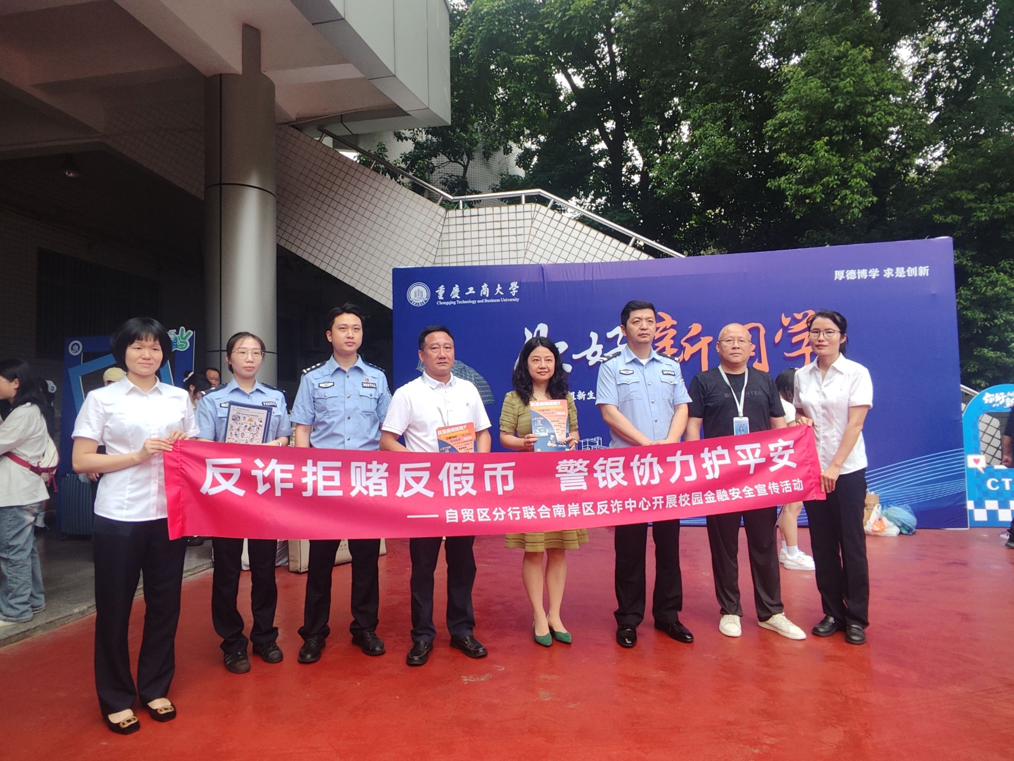 9月9日上午,我校保卫处联合南岸区反诈中心与工商银行南岸区分行,在南岸校区迎新报到点体艺馆开展了一场反诈主题宣传活动。保卫处处长沙云、副处长邱胜祥、南岸区反诈中心教导员张凌云、中国工商银行重庆自贸分行副行长熊洁等参加。三方协同发力,将反诈知识融入新生报到的环节,通过发放反诈宣传册和现场讲解,还原了诈骗分子针对新生的套路。民警特别强调:新生刚脱离家庭独立生活,面对各类“诱惑”和“机会”时容易放松警惕,一定要牢记“未知链接不点击、陌生来电不轻信、个人信息不泄露、转账汇款多核实”的原...