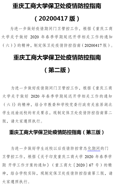 在不断总结门卫管控经验的基础上,根据学校实时的防控要求,制作了三版《重庆工商大学保卫处疫情防控指南》,细化了管控总体要求、人员车辆分类、外来人员车辆提前报备、出入证办理及使用、人员车辆查验、返校学生扫码操作、临时突发情况处置等多个方面的操作流程。《指南》因其指导性强、适用度高,被保卫处干部和安保队员们视为门卫管控的“葵花宝典”。