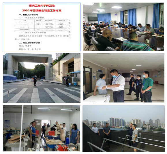 七是扎实开展专项工作。根据《中共重庆工商大学委员会关于印发重庆工商大学校园安全专项整治三年行动实施方案的通知》(重工商大委〔2020〕54 号 )和《关于开展安全隐患大排查大整治大执法决战决胜高温汛期工作的通知》要求,相关专项工作正在扎实推进。