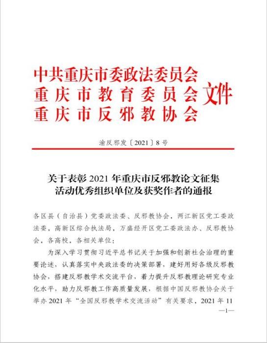 近日,在市委政法委、市教委、市反邪教协会联合开展的全市反邪教论文征集活动中,党委保卫部(保卫处)黄杰渝同志撰写的《主流媒体反邪教宣传报道现状及建议》获得一等奖,秦爽同志撰写的《新时代高校创新反邪教警示宣传教育思路探析》获得三等奖。党委保卫部(保卫处)将再接再厉,不断提高反邪教理论研究水平,为维护学校政治安全作出新的更大贡献。