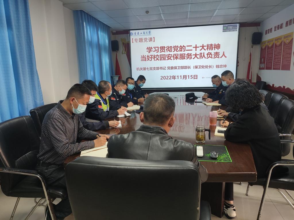 15:00,支部书记、保卫部部长(保卫处处长)钱忠坤为安保大队上专题党课“学习贯彻党的二十大精神,当好校园安保服务大队负责人”,要求大队以更加饱满的工作热情,以“时时放心不下”的责任感投入到具体工作中,切实把校园疫情防控和安全稳定各项工作做细做实做好。王树坤、曹晓丽、何炫梁参加本次专题党课学习。