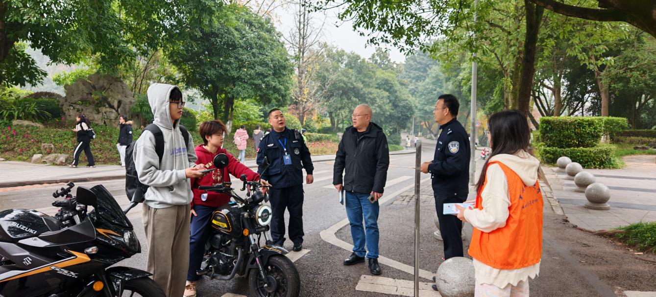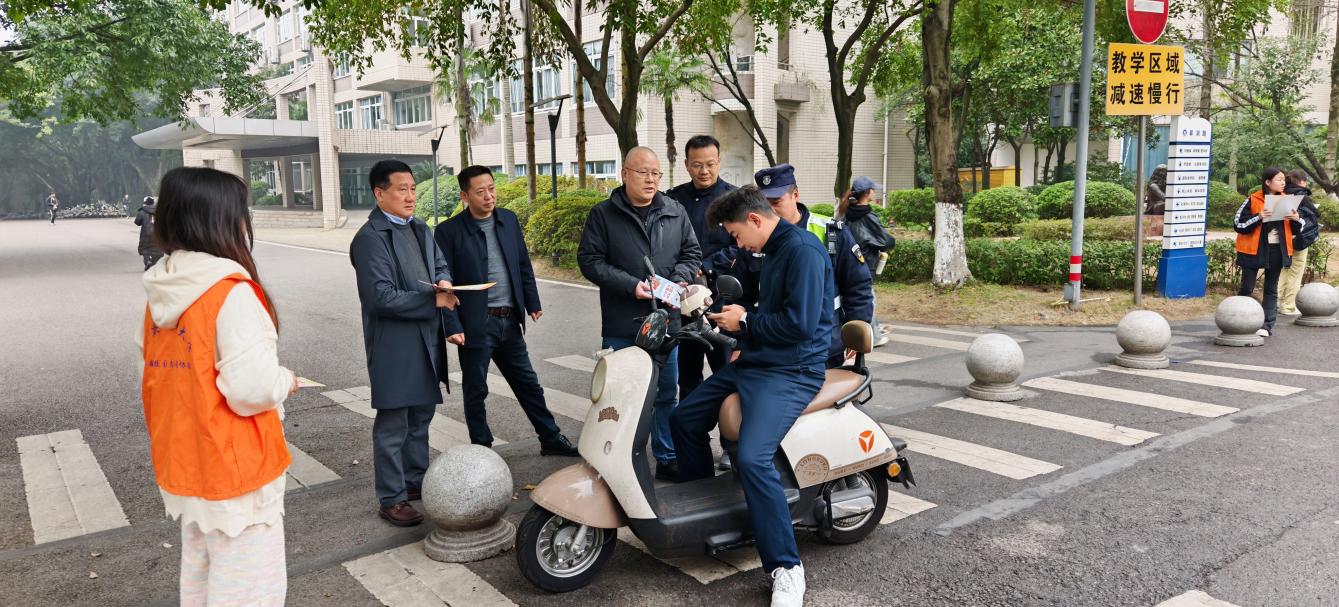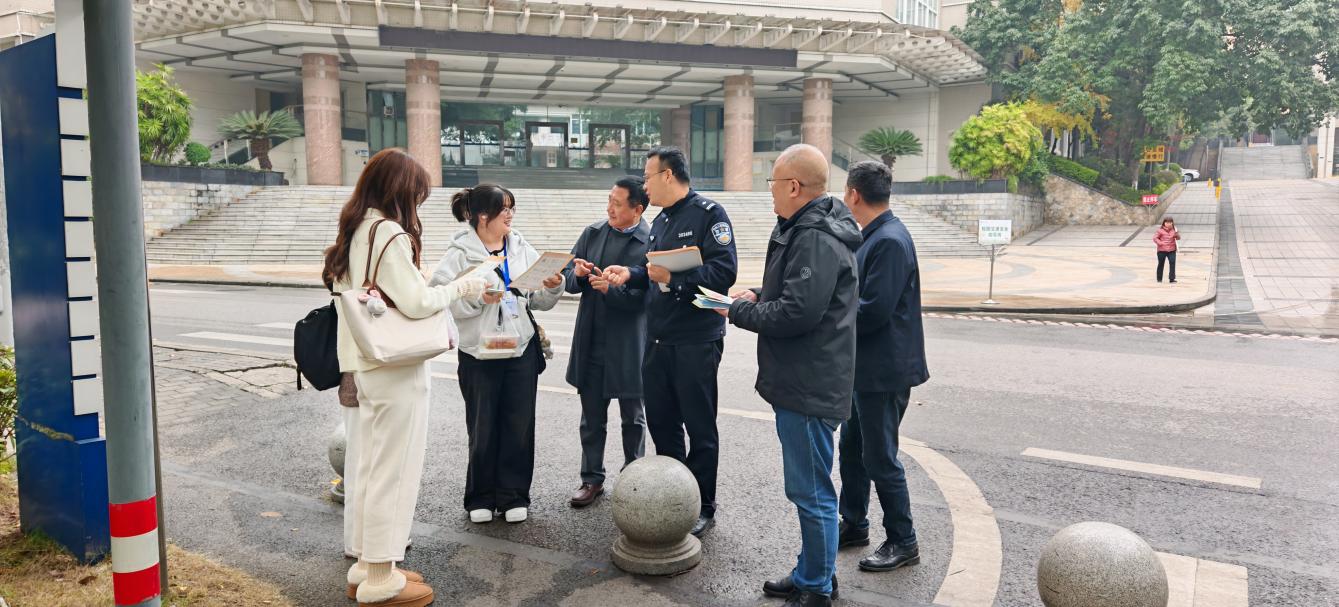 为进一步筑牢校园安全防线,切实提升广大师生的交通安全意识和防范电信网络诈骗能力,营造安全、文明、和谐的校园环境,12月10日11:30-12:10,我校保卫处联合辖区四公里派出所,在南岸校区博智楼与启智楼路口下课高峰期,组织开展了一场校园交通安全劝导与反诈骗宣传教育活动。四公里派出所刘国魁警官、保卫处沙云处长、邱胜祥副处长、王树坤副处长、治安科彭文涛科长、安保大队王再会队长及9名队员、平安校园志愿者协会4名会员参加。