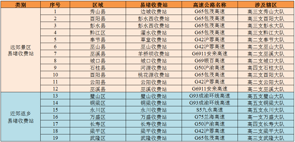 一是“5天长假”带动的长距离自驾游、远郊游景区将迎来车流集中出行,预计渝东南片区中,秀山县洪安古镇的G65包茂边城收费站,酉阳县龚滩古镇、彭水县摩围山景区的G65包茂彭水西收费站,黔江区濯水古镇的G65包茂濯水收费站;渝东北片区中,奉节县三峡之巅景区的G42沪蓉草堂收费站,巫山县小三峡景区的G42沪蓉巫山收费站,巫溪县红池坝景区的G6911安来羊桥坝收费站,城口县亢谷景区、黄安坝景区的G69银百城口收费站,石柱县黄水景区的G50沪渝河源收费站等远郊收费站车流量将明显增大。