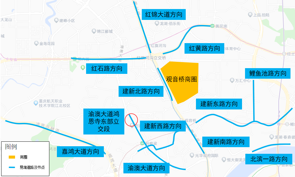 三是与观音桥商圈北边相邻的红锦大道、红黄路、建新北路、红石路,东边相邻的建新东路、鲤鱼池路,南边相邻的建新南路、北滨一路,西边相邻的嘉鸿大道、渝澳大道、建新西路等商圈周边道路易在11时至20时出现时段性拥堵。观音桥商圈周边易堵道路分布如下图所示:
