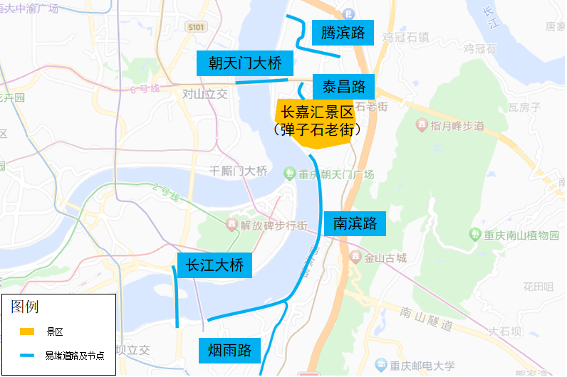 2.长嘉汇景区方面,因该景区为两江四岸最佳夜景观赏点,预计长嘉汇景区和弹子石老街周边车流量将迎来激增,与长嘉汇景区北边相邻的腾滨路、朝天门大桥,东边相邻的烟雨路、泰昌路,南边相邻的南滨路、长江大桥等主要道路和桥梁易在18时30分至22时30出行拥堵缓行。长嘉汇景区周边易堵桥梁及道路分布如下图所示: