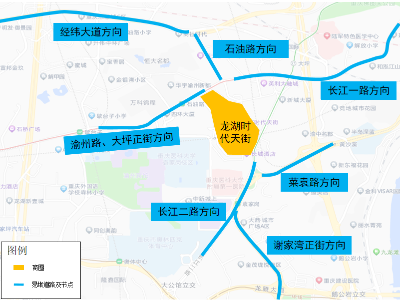 二是与龙湖时代天街商圈北边相邻的经纬大道、石油路,东边相邻的长江一路、南边相邻的菜袁路、长江二路、谢家湾正街,西边相邻的大坪正街、渝州路等商圈周边道路易在10时至19时迎来时段性拥堵。龙湖时代天街商圈周边易堵道路分布如下图所示: