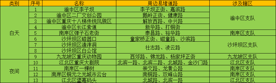五一假期,我市传统网红景区周边道路流量也将有所增加。白天时段,渝中区李子坝、二厂文创公园周边的李子坝正街、鹅岭正街、健康路,十八梯、长江索道周边的中兴路、解放西路、新华路、打铜街,九龙坡区重庆动物园周边的西郊路、锦龙路、杨家坪正街,沙坪坝区磁器口、渣滓洞、白公馆周边的童家桥正街、沙滨路、磁童路、壮志路、凌云路等网红景区周边道路在10时至16时易出现时段性拥堵。夜间时段,江北区大剧院周边的北滨一路、北滨二路、北城路、金沙门路,南岸区南山一棵树周边的龙黄公路、崇文路等网红景区周边道路在19时至22时易呈现车多缓行态势。易堵路段如下表所示: