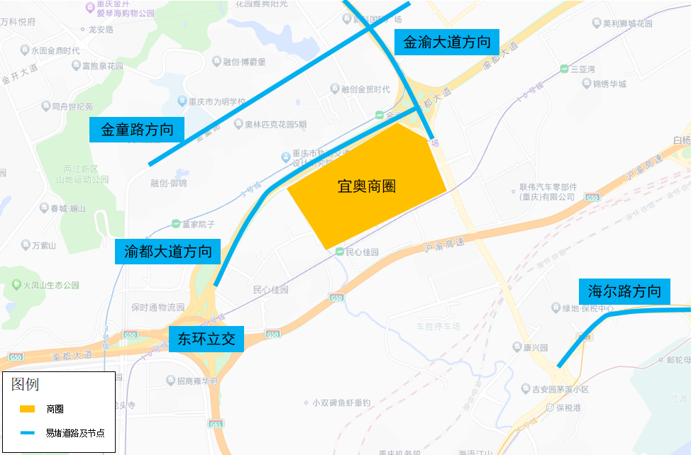 一是与宜奥商圈北边相邻的金渝大道、金童路,南边相邻的海尔路,西边相邻的渝都大道、东环立交等商圈周边节点和道路易在10时至19时迎来时段性拥堵。宜奥商圈周边易堵节点及道路分布如下图所示:
