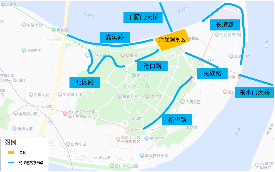 1.洪崖洞景区方面,预计与洪崖洞景区北边相邻的千厮门大桥,东边相邻的长滨路、东水门大桥,南边相邻的民族路、沧白路、新华路,西边相邻的嘉滨路、北区路等主要道路和桥梁易在16时至24时出现拥堵缓行。洪崖洞景区周边易堵桥梁及道路分布如下图所示: