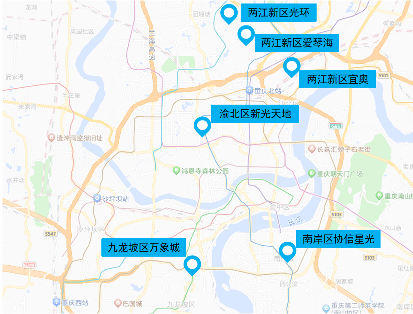 两江新区光环购物公园、爱琴海购物公园,渝北区新光天地,九龙坡区万象城商圈,南岸区协信星光商圈等其他重点商圈周边也将迎来时段性拥堵。其中,两江新区光环购物公园和爱琴海购物公园周边的金山大道、金开大道、金州大道,渝北区新光天地周边的红锦大道、嘉州路,九龙坡区万象城商圈周边的谢家湾正街、万象大道,南岸区协信星光周边的江南大道、辅仁路等商圈周边道路易在15时至20时出行时段性拥堵。中心城区其他易堵商圈点位如下图所示: