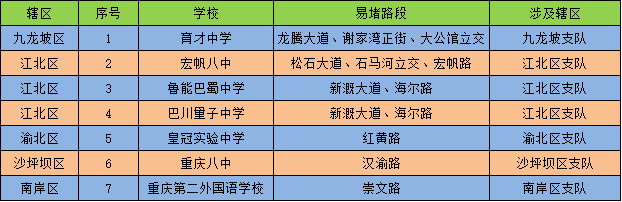 预计节日最后一天(5月3日)我市大量初高中住读生将提前返校,在15时30分开始将迎来学生返校高峰,其中九龙坡区育才中学周边龙腾大道、谢家湾正街、大公馆立交,江北区宏帆八中、鲁能巴蜀中学、巴川量子中学周边松石大道、石马河立交、宏帆路、新溉大道、海尔路,渝北区皇冠实验中学周边红黄路,沙坪坝区重庆八中周边汉渝路,南岸区重庆第二外国语学校周边崇文路将出现时段性拥堵,至18时左右拥堵趋于正常。校园周边易堵路段如下表所示: