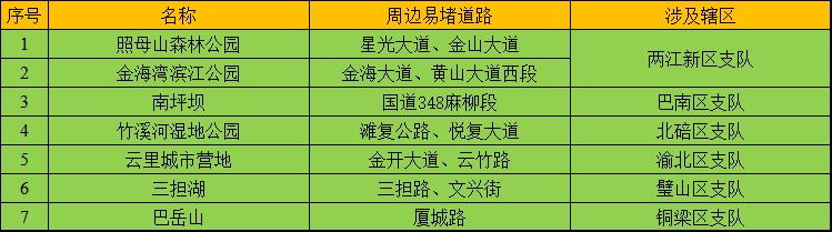 因春夏交季,气候宜人,预计我市中心城区和近郊露营基地周边将迎来集中出行。其中,与两江新区金海湾滨江公园相邻的金海大道、黄山大道西段,与北碚区竹溪河湿地公园相邻的滩复公路、悦复大道,与渝北区云里城市营地相邻的金开大道、云竹路,与璧山区三担湖相邻的三担路、文兴街等露营基地周边道路拥堵时段集中在10时至14时。主要露营基地周边易堵道路如下表所示: