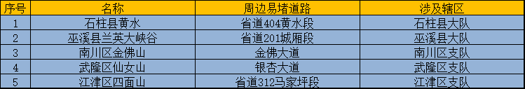 五一期间,因我市天气转暖,预计我市主要清凉景区将迎来出行高峰,石柱黄水周边的省道404黄水段、巫溪兰英大峡谷周边的省道201城厢段、南川金佛山周边的金佛大道、武隆仙女山周边的银杏大道、江津四面山周边的省道312马家坪段等避暑景区周边道路易出现拥堵缓行。远郊区县清凉游景区易堵道路如下表所示: