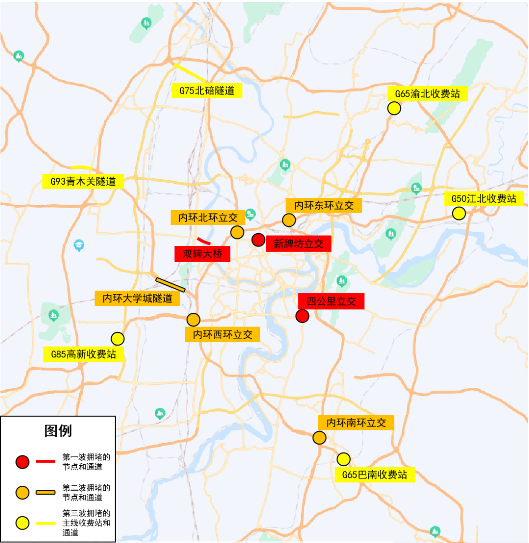 三是9时20分左右开始,G50沪渝高速江北收费站、G65包茂高速巴南收费站、G65包茂高速渝北收费站、G85银昆高速高新收费站、G75兰海高速北碚隧道、G93成渝环线高速青木关隧道等高速主线收费站和出城通道呈车多缓行态势,预计上述易堵通道节点拥堵情况将持续到12时30分左右。
