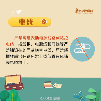学生公寓人员密集,冬季防火安全显得尤为重要。这些事项要注意:严禁随意改动电源线路或私拉电线;不要在宿舍没人的情况下长时间充电;不要用可燃物直接遮挡白炽灯泡……看图学习。