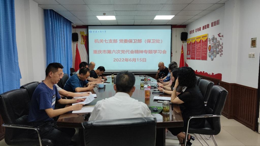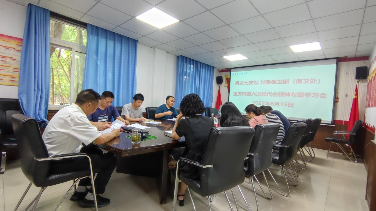 根据《机关第七党支部 党委保卫部(保卫处)学习宣传贯彻中国共产党重庆市第六次党代会精神工作方案》的安排和要求,6月15日下午,机关第七党支部、党委保卫部(保卫处)在党员活动室举行市第六次党代会精神专题学习会。支部党员、干部,安保大队队长副队长参加了会议,会议由支部书记、党委保卫部部长(保卫处处长)钱忠坤同志主持。
