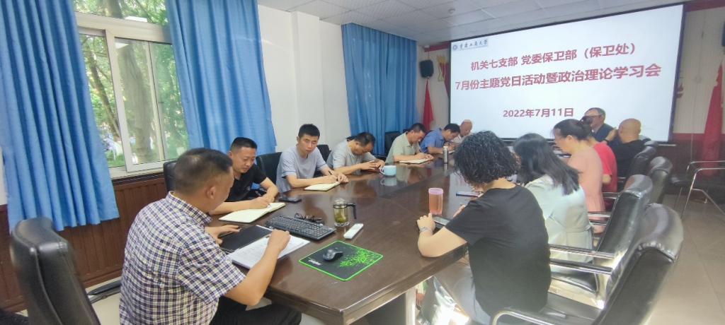 7月11日上午,机关七支部在党员活动室开展了七月份主题党日暨政治理论学习活动。支部党员、部门干部、安保大队队长副队长参加了活动,活动由支部书记、党委保卫部部长(保卫处处长)钱忠坤主持。