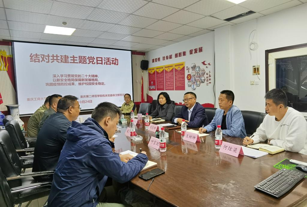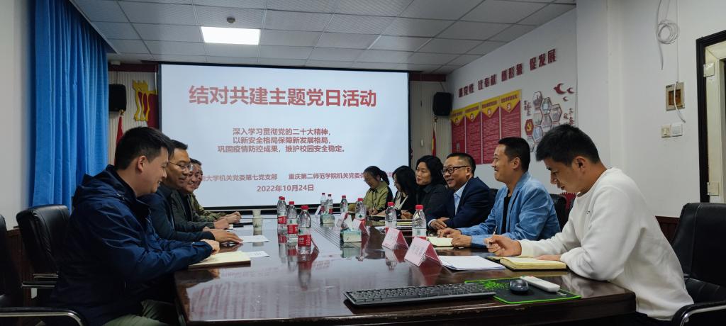 18:00,重庆工商大学2003网站太阳集团第七党支部与重庆第二师范学院2003网站太阳集团保卫部党支部开展了结对共建主题党日活动,会上钱忠坤书记对机关七支部党委保卫部(保卫处)应对1011校园新冠疫情应急处置的经验进行了分享,双方就校园疫情防控工作进行了深度交流。