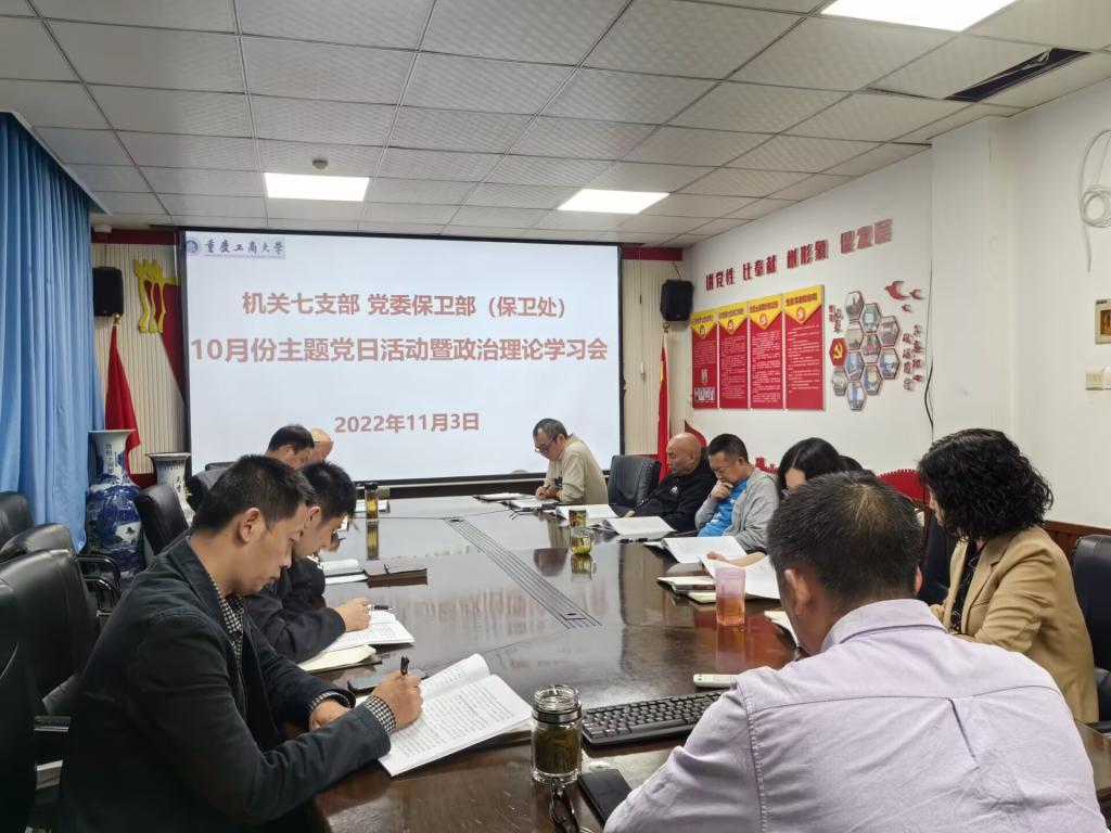 为深入学习贯彻党的二十大精神,11月3日上午,机关七支部、党委保卫部(保卫处)在党员活动室开展了10月份第三次主题党日活动暨政治理论学习会。活动采取线上线下相结合的方式进行。支部党员、部门干部、安保大队队长副队长参加了活动,活动由支部书记、党委保卫部部长(保卫处处长)钱忠坤同志主持。