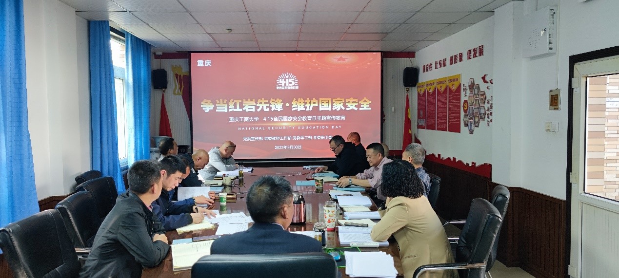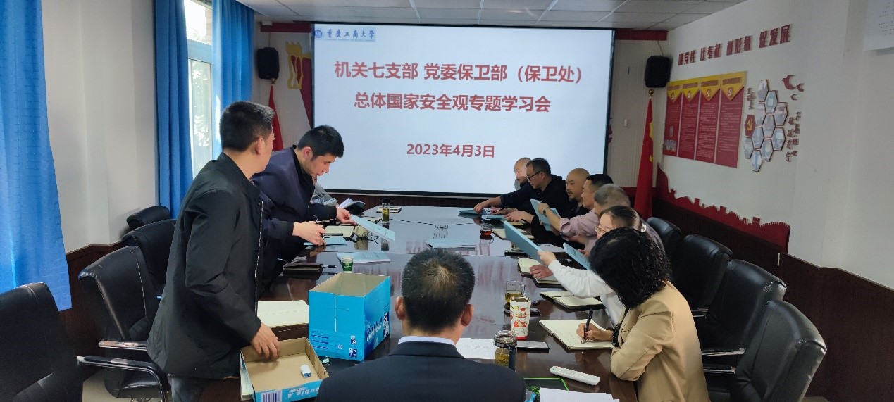 按照《中共重庆工商大学委员会关于印发重庆工商大学 2023年全民国家安全教育日主题宣传活动方案的通知》(重工商大委发〔2023〕30 号)的安排部署,4月3日下午,机关七支部、党委保卫部(保卫处)在支部党员活动室召开了总体国家安全观专题学习会,支部党员、保卫干部、安保大队队长和副队长参加了学习会,支部书记、党委保卫部部长(保卫处处长)钱忠坤同志主持会议。