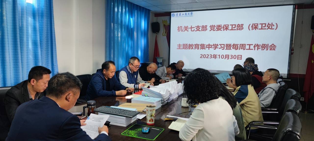 10月30日下午,机关七支部、党委保卫部(保卫处)在支部党员活动室召开了主题教育集中学习暨每周工作例会。支部党员、保卫干部、安保大队队长和副队长参加了会议,会议由支部书记、党委保卫部部长(保卫处处长)钱忠坤同志主持。