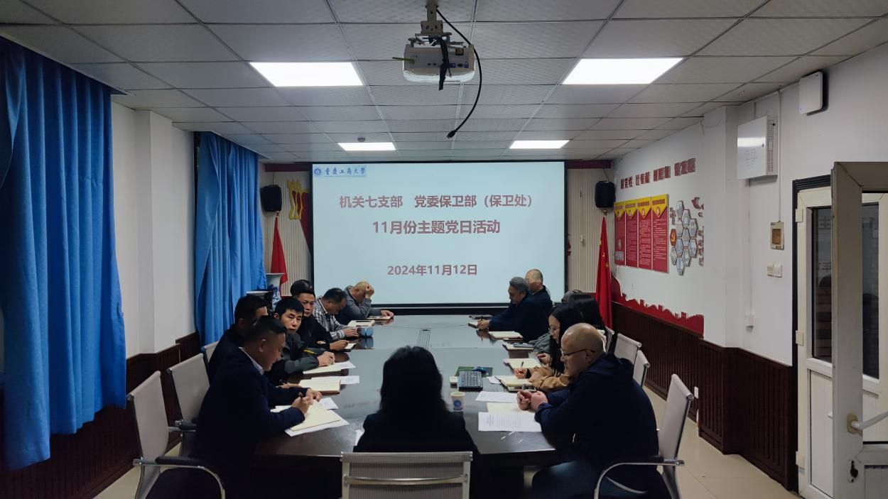 11月12日下午,机关七支部、党委保卫部(保卫处)在支部党员活动室集中开展了11月份主题党日活动。活动采取“线下集中学+线上自主学+线上推送学+自己跟进学”的方式进行,活动主题为“强基固本筑堡垒 迎评促建谋发展”。支部党员、部门干部、安保大队队长副队长参加了活动,支部书记、党委保卫部部长(保卫处处长)沙云同志主持活动,分管校领导、党委副书记宋豫以普通党员身份参加。